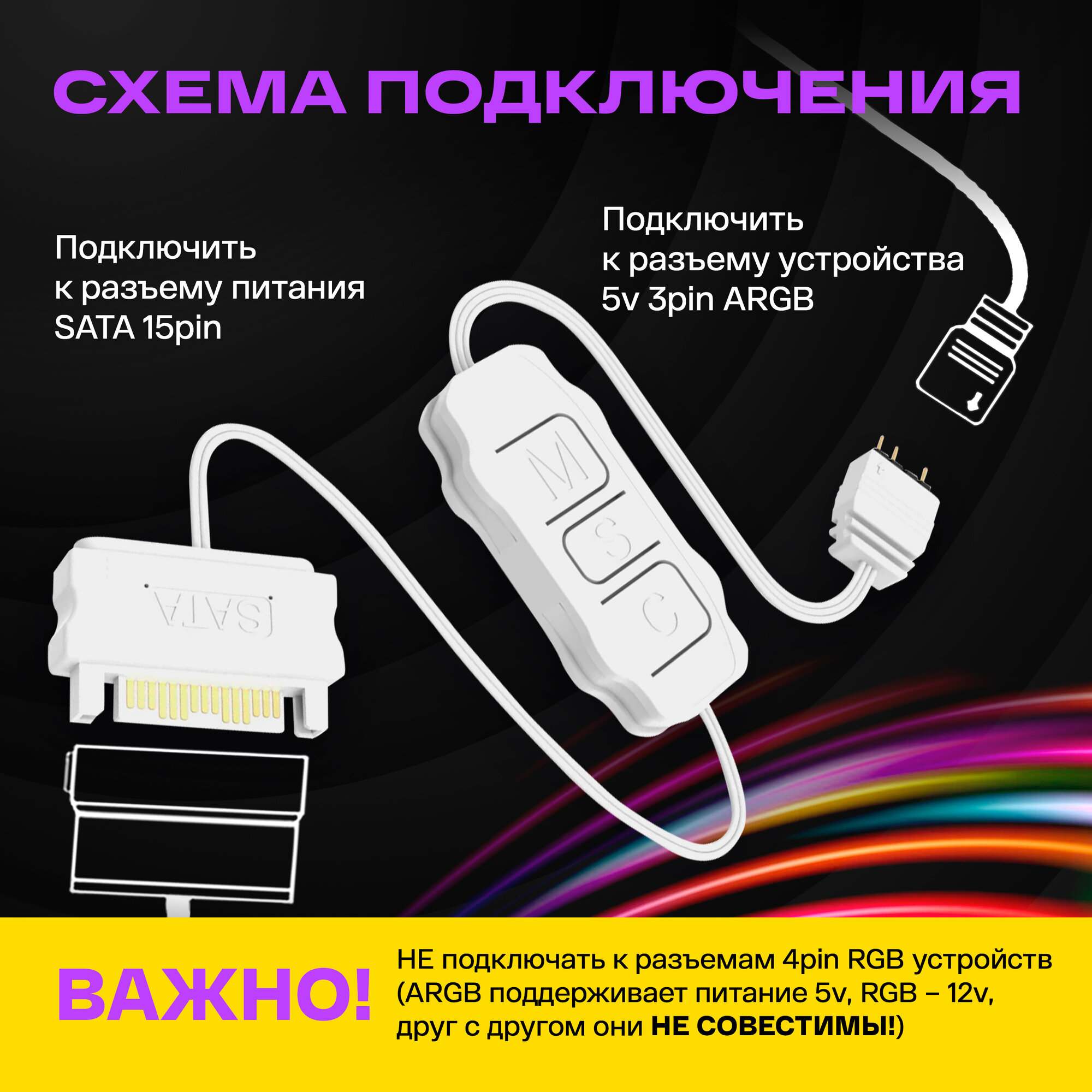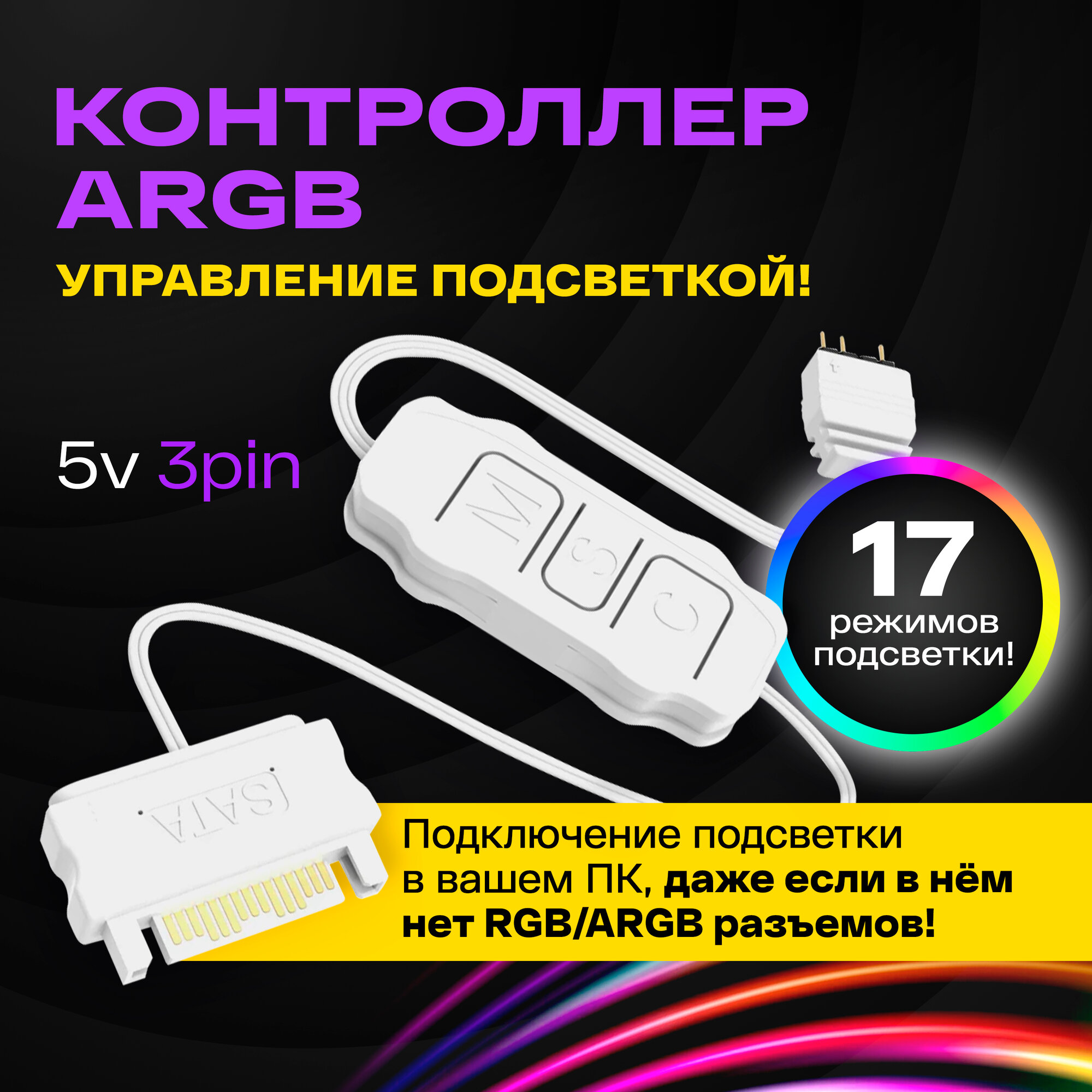 Контроллер ARGB для вентиляторов с подсветкой 5V3PIN, питание SATA 15 PIN, для управления кулеров c подсветкой корпуса