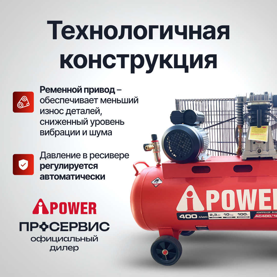 Компрессор поршневой масляный ременной A-iPower AC400/100B (10 Бар, 400 л/мин, 2200 Вт, 100 л, 72 кг) информация: