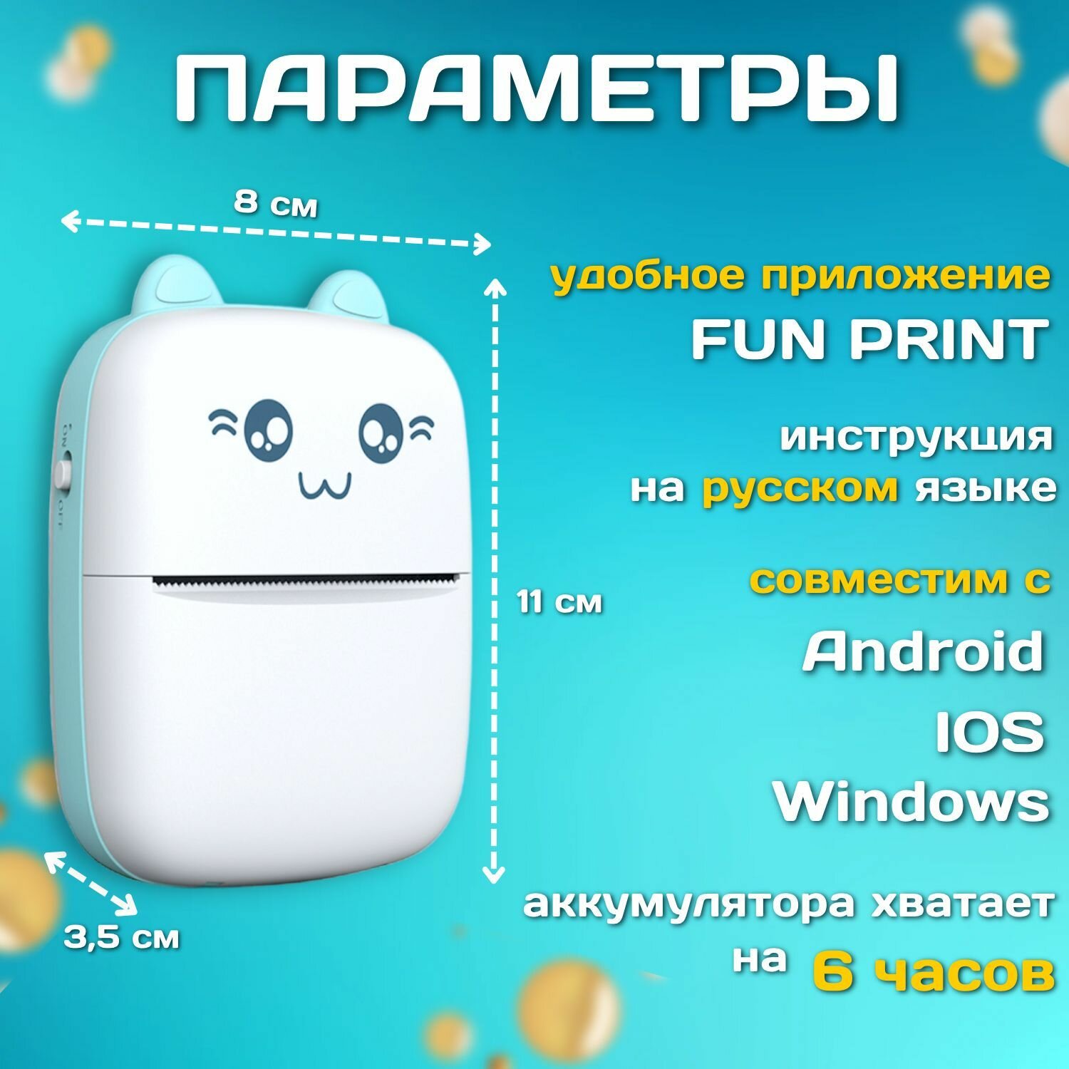| Комплектация | мини принтер для телефона; инструкция для детского принтера; usb-кабель для зарядки принтера портативного 6 рулонов термобумаги |
