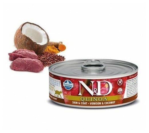 Farmina Консервы N&D QUINOA SKIN&COAT VENISON&COCONUT для кошек киноа оленина с кокосом для здоровья кожи и шерсти 80 гр информация: