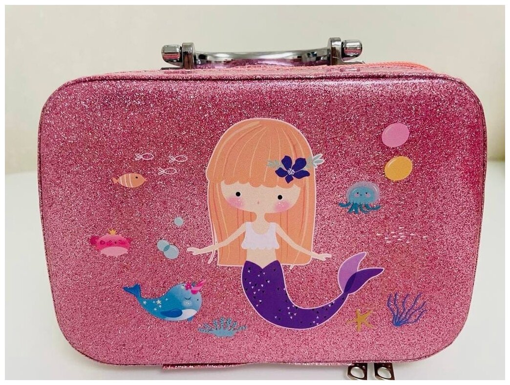 | Состав | Чемоданчик с зеркальцем два о одном, можно использовать как органайзер для украшений или как косметичку. В состав входит: Кисточки для макияжа - 5 шт. Лаки для ногтей - 3 шт. Палетка большая из 12 штук с блестками Палетка маленькая из 3 штук. Пилочка для ногтей Разделитель пальчиков Резиночки 2 шт. Помада для губ - 2 шт. Расческа трансформер с зеркальцем Блеск для губ Пудра с зеркальцем и спонжиком для нанесения пудры Румяна Набор стикеров |