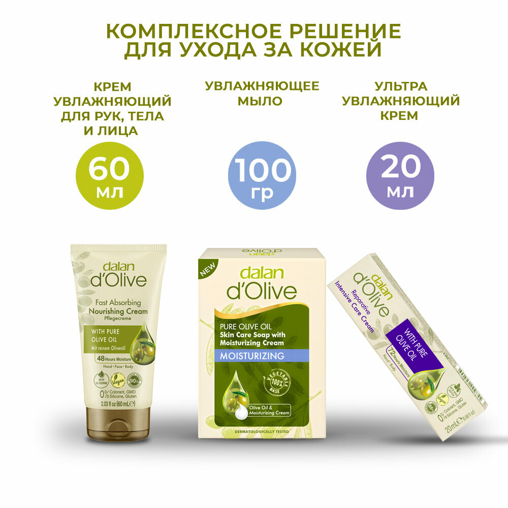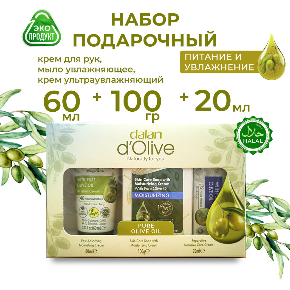 10 цен на Подарочный набор Dalan D'Olive турецкой косметики 180 гр: увлажняющий крем 60 мл, мыло 100 гр, интенсивный крем 20 мл