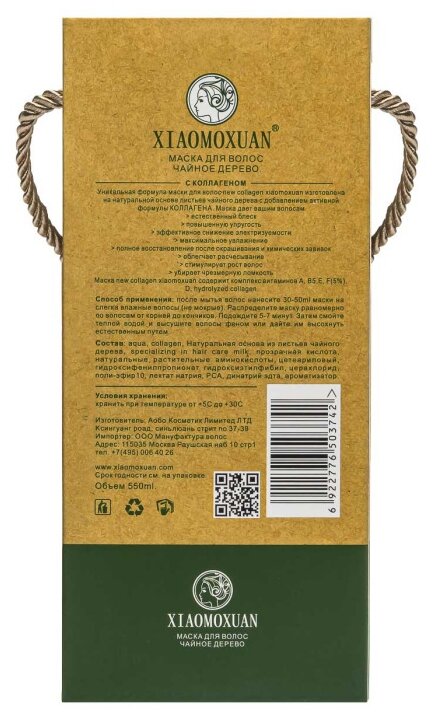 | Способ применения | после мытья волос нанесите 30-50 мл маски на влажные волосы (не мокрые); распределите маску равномерно по волосам от корней до кончиков; подождите 5-7 минут.; затем смойте слегка тёплой водой, промокните полотенцем мокрые волосы, далее с кончиков в верх расчешите влажные волосы; высушите феном или дайте волосам высохнуть естественным путём |