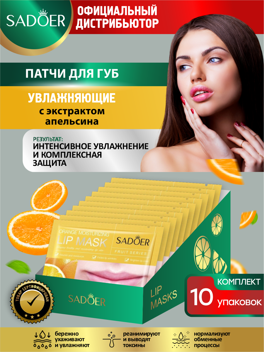 10 цен на Увлажняющие патчи для губ Sadoer с экстрактом апельсина 8 гр. х 10 шт.