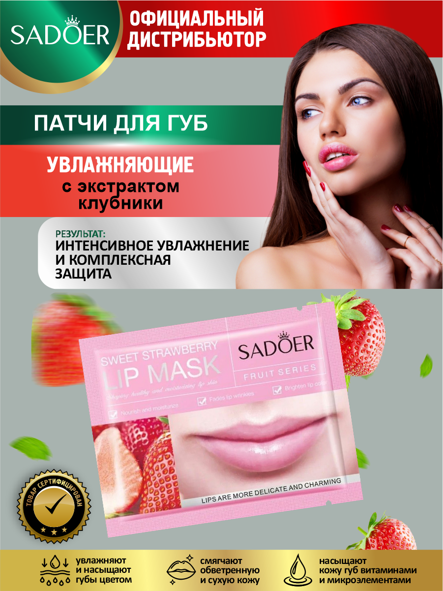 | Состав | Увлажняющие патчи для губ Sadoer с экстрактом клубники 8 гр. х 5 шт. |