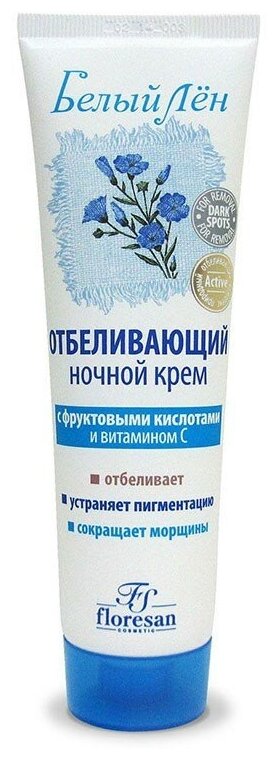 | Дополнительная информация | Floresan Белый лен Отбеливающий ночной крем, обогащенный витамином С 100 мл и мощными депигментирующим комплексом разработан для ухода за кожей в ночное время. Фруктовые кислоты отшелушивают верхний слой эпидермиса, устраняя избыточную пигментацию, экстракт огурца и витамин С осветляют и выравнивают общий тон кожи, предотвращая появление веснушек и пигментных пятен. Экстракт семян льна питает и увлажняет кожу, делая ее мягкой и эластичной. Ежедневное использование отбеливающего крема предотвращает появление пигментных пятен, замедляет старение кожи, сохраняет оптимальный уровень влаги в коже и препятствует появлению морщин. |