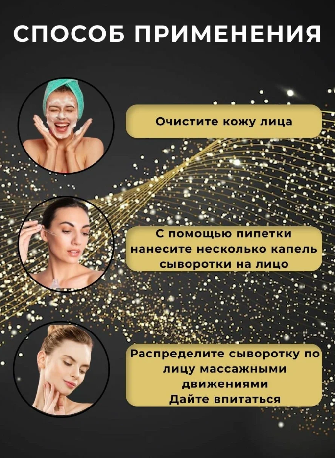 | Способ применения | Маска сыворотка для лица, антивозрастная, с комплексом гиалурона и коллоидного золота, c подтягивающим эффектом Jomtam : Использовать маску сыворотку можно без ограничений утром и вечером Способ применения: 1. Перед нанесением сыворотки тщательно очистите кожу от дневных загрязнений и макияжа. 2. С помощью пипетки нанесите на ладонь или сразу на лицо, затем распределите по коже лица и вбейте легкими похлопываниями пальцев. 3. Дайте впитаться, потом можете наносить макияж или ночной крем, по желанию. Спустя неделю Вы увидите, как меняется кожа лица в лучшую сторону. Через месяц, просто обалдеете, как помолодела Ваша кожа лица. |