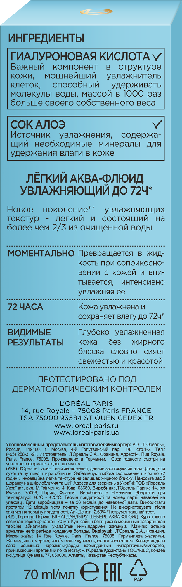 L`OREAL гений увлажнения Аква-флюид чувст. кожи 70 мл информация:
