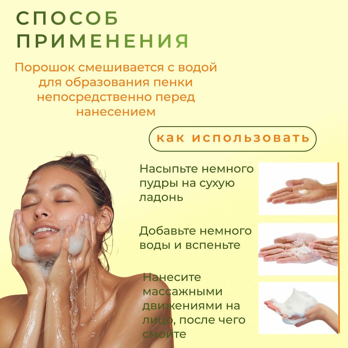 | Способ применения | высыпать небольшое количество пудры на ладонь, вспенить и нанести массажными движениями на лицо; смыть теплой водой |