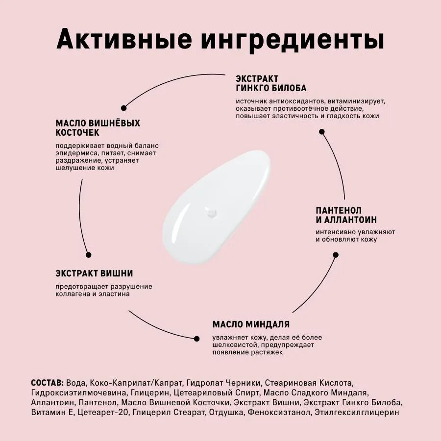 | Состав | Aqua (Water), Coco-Caprylate/Caprate, Vaccinium Myrtillus (Blueberry) Fruit Water, Stearic Acid, Hydroxyethyl Urea, Glycerin, Cetearyl Alcohol, Prunus Amygdalus Dulcis (Sweet Almond) Oil, Allantoin, Panthenol, Prunus Cerasus (Cherry) Kernel Oil, Prunus Cerasus (Bitter Cherry) Extract, Ginkgo Biloba Extract, Tocopheryl Acetate, Ceteareth-20, Glyceryl Stearate, Fragrance, Phenoxyethanol, Ethylhexylglycerin |