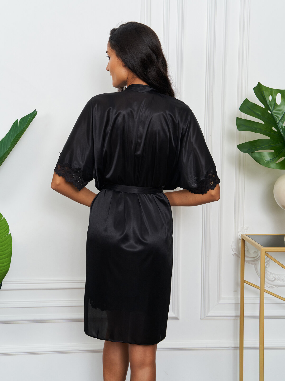 10 цен на Халат домашний шелковый пеньюар длинный неглиже Belweiss с кружевами черный, размер 44-50