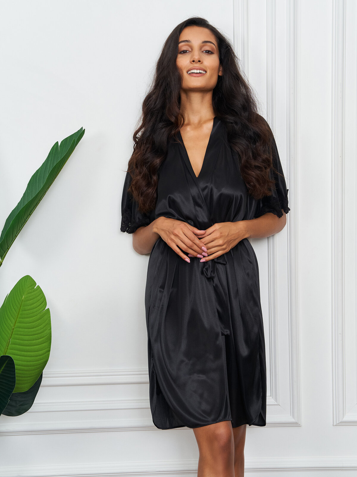 Халат домашний шелковый пеньюар длинный неглиже Belweiss с кружевами черный, размер 44-50 информация: