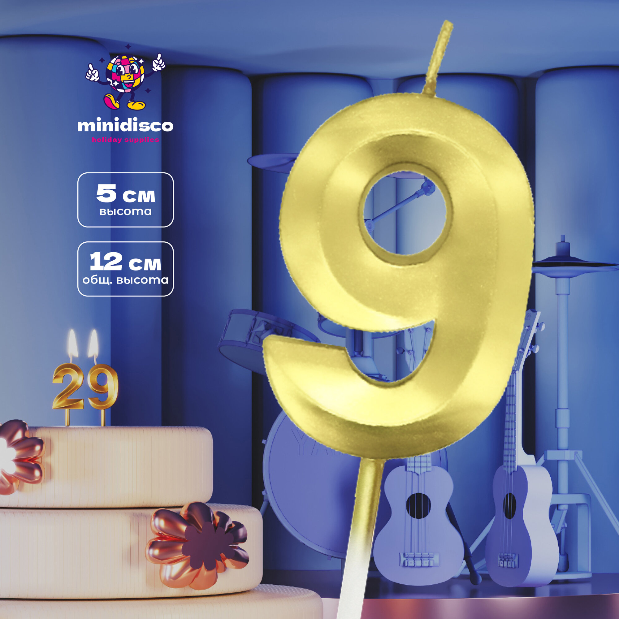 Свеча для торта "Цифра 9" золотая, 5см, 1шт, Minidiscо информация: