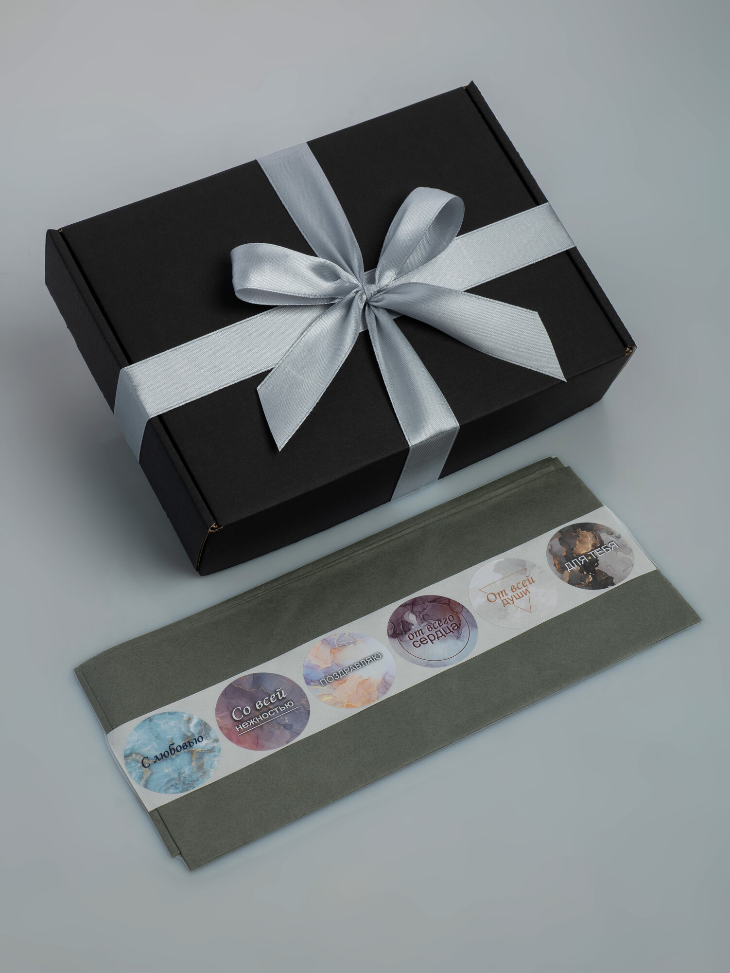 | Комплектация | 1 крафтовая коробка черная, бумага тишью, сатиновая лента 1.5м, набор наклеек для любой категории людей. |