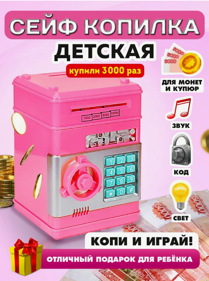 Отзывы на Копилка сейф для денег детская / Игрушка-копилка Сейф со световыми и звуковыми эффектами розовый