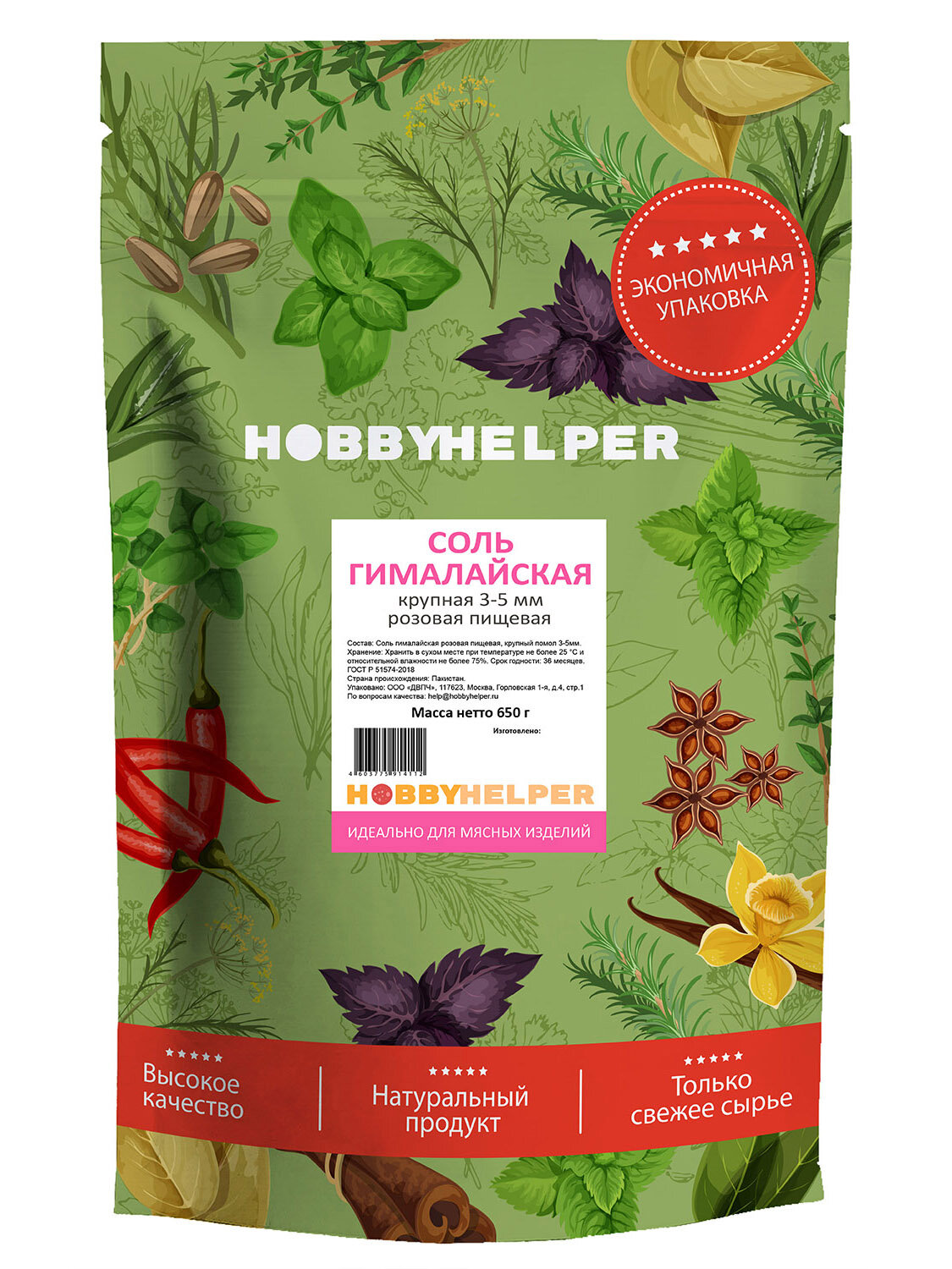 Соль гималайская розовая № 1 (крупная 3-5 мм) HOBBYHELPER дой пак 650гр информация:
