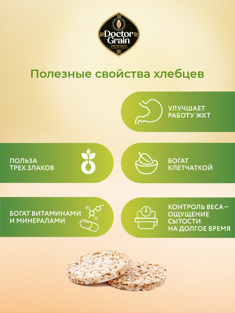 | Дополнительная информация | Наши хлебцы изготавливаются методом экструзии, их считают самыми полезными. Суть экструзии очень похожа на изготовление попкорна: заранее подготовленную смесь зёрен замачивают для смягчения грубой оболочки. После этого размягчённые зёрна в экструдере обрабатывают при высоком давлении и температуре до 300 градусов около 8 секунд. При этом вода, которой напитались зёрна, мгновенно превращается в пар, «выкручивая» зёрна наружу, а высокое давление спрессовывает их в брикет. В составе таких хлебцев исключительно цельное зерно. Такие хлебцы считаются самыми здоровыми. |