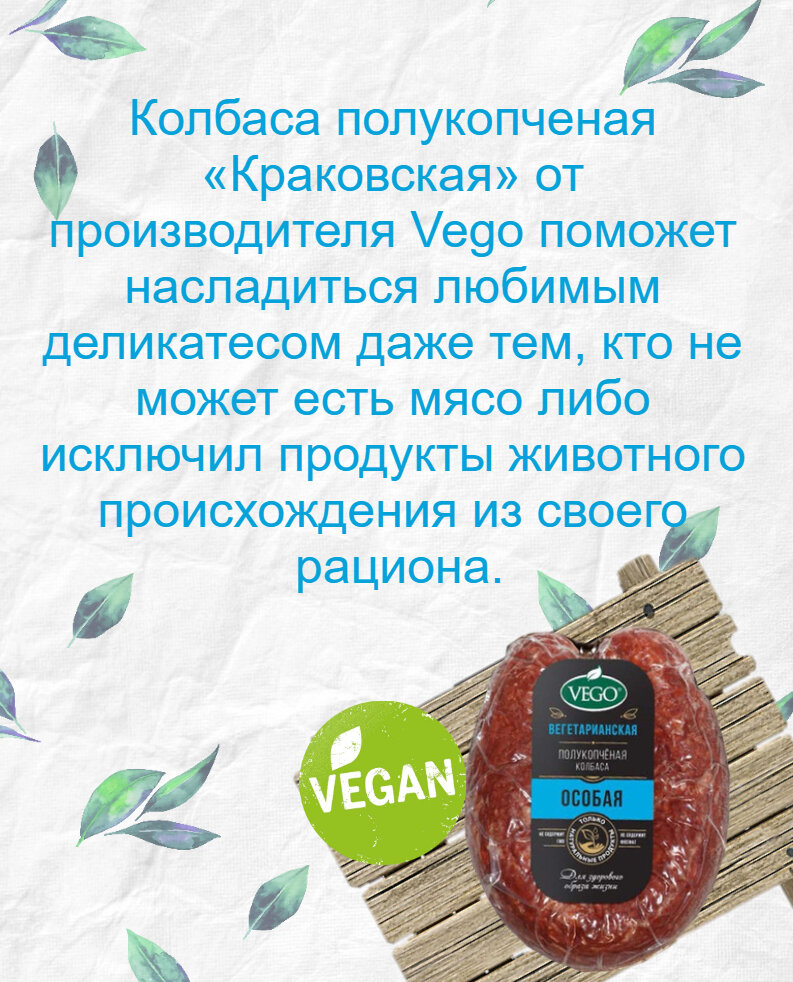 Колбаса постная полукопченая "Краковская веганская" растительный продукт, 450 г VEGO информация: