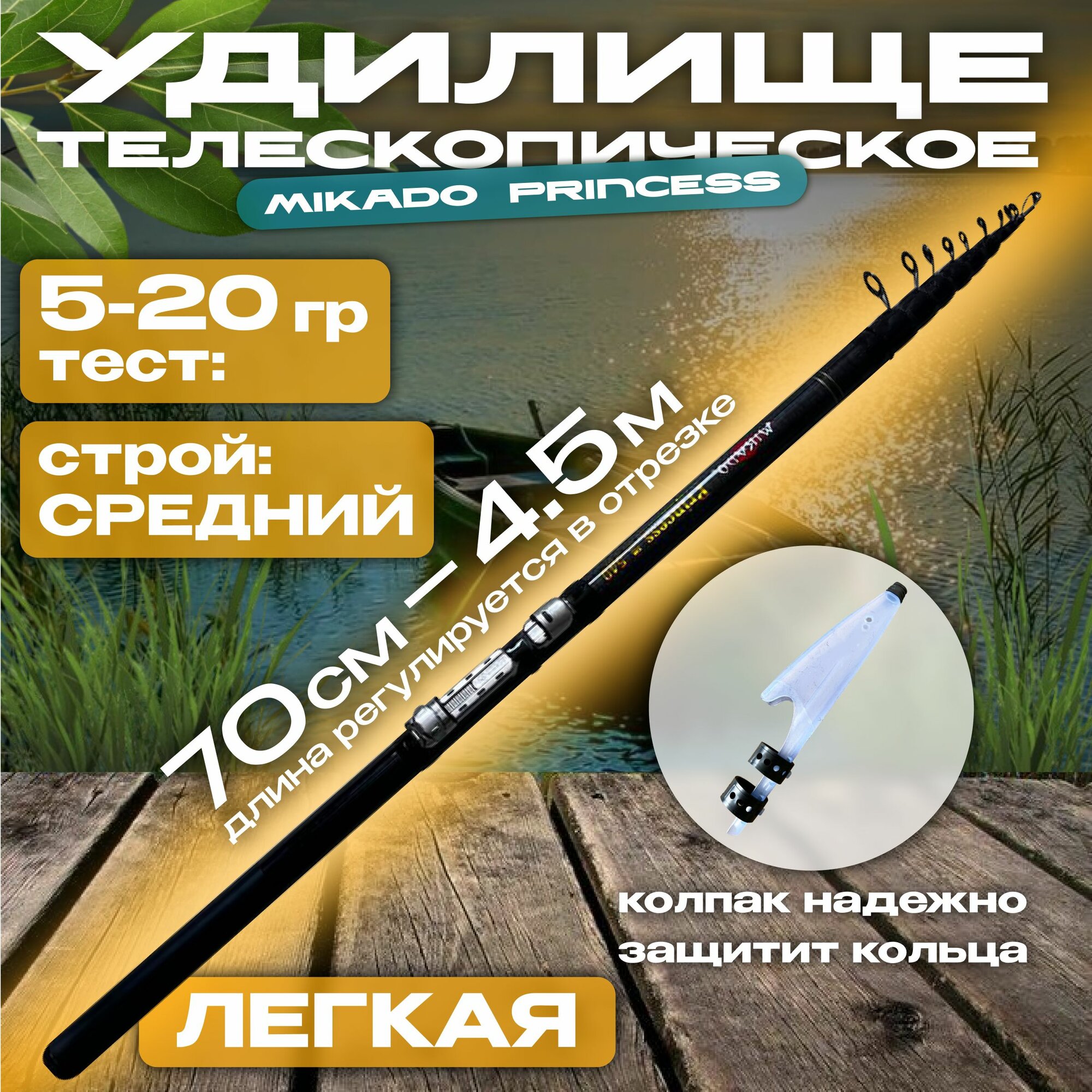 Отзывы на Удилище телескопическое болонское с пропускными кольцами SiC, 4,5 м тест 5-20 г. Удочка Mikado Princess 450