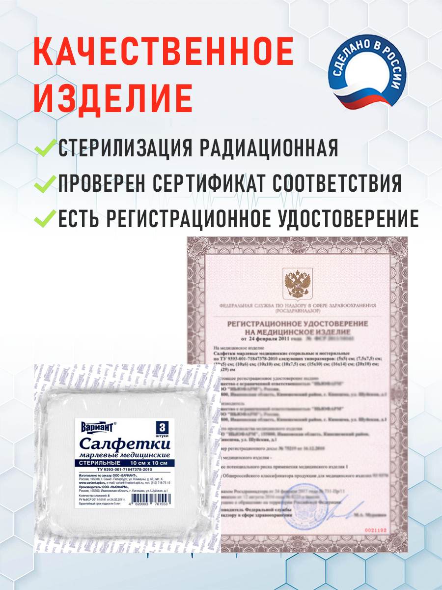 Салфетки марлевые Вариант медицинские стерильные 10см х 10 см №3, 8сл 32г блистер, 5 упаковок в наборе информация: