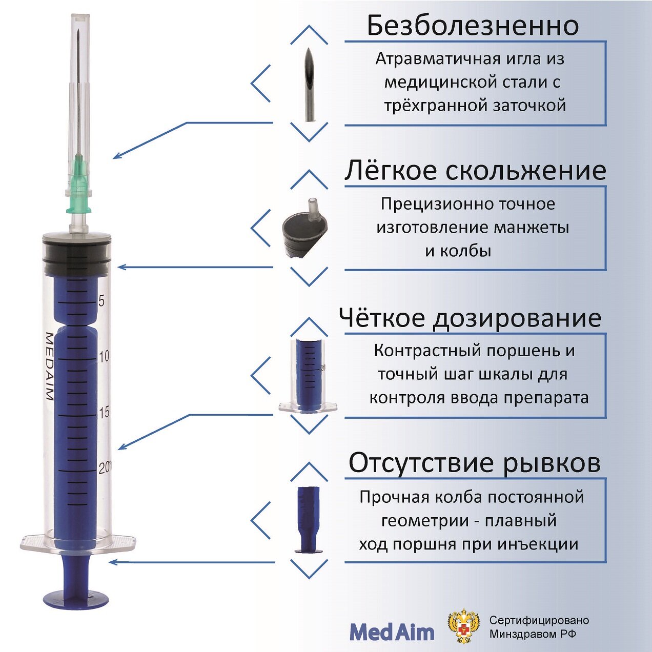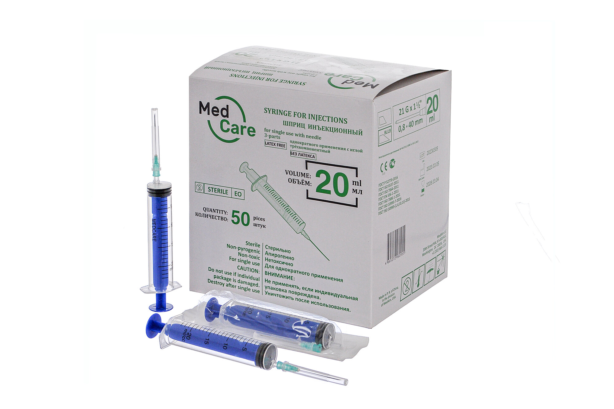 MedAim Шприц инъекц. 20 мл 3-х комп. с иглой 0,8*40 мм (21G*1 1/2") без латекса