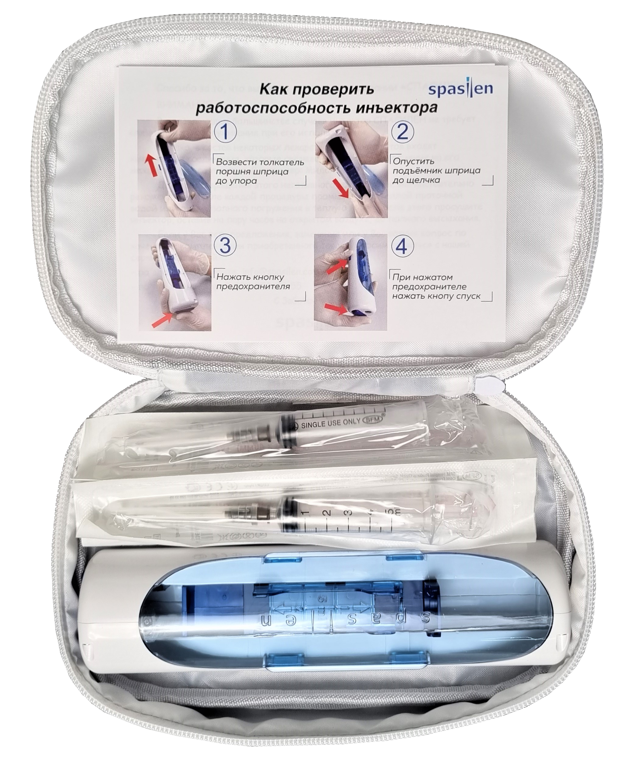 | Дополнительная информация | Инъектор Spasilen(Спассилен), в комплекте со шприцами 5мл 50шт и чехлом-аптечкой |