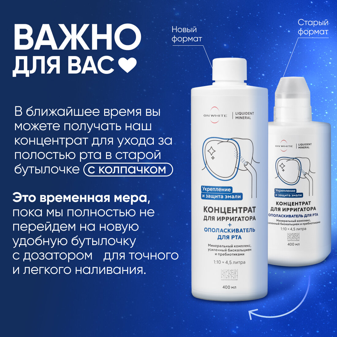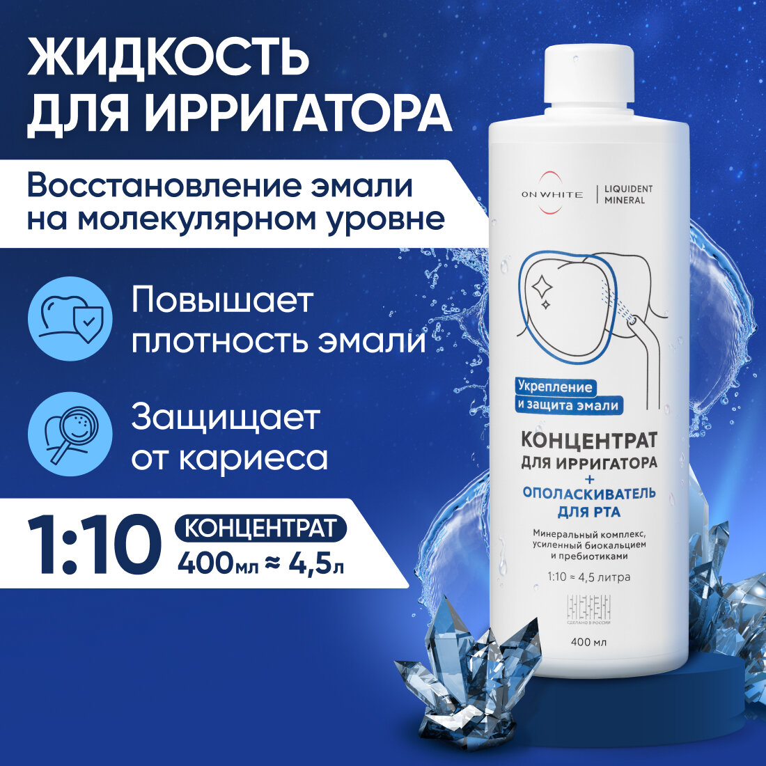 Ополаскиватель для полости рта и жидкость для ирригатора концентрат Минеральный комплекс с биокальцием и пребиотиками ON WHITE, 400 мл. информация: