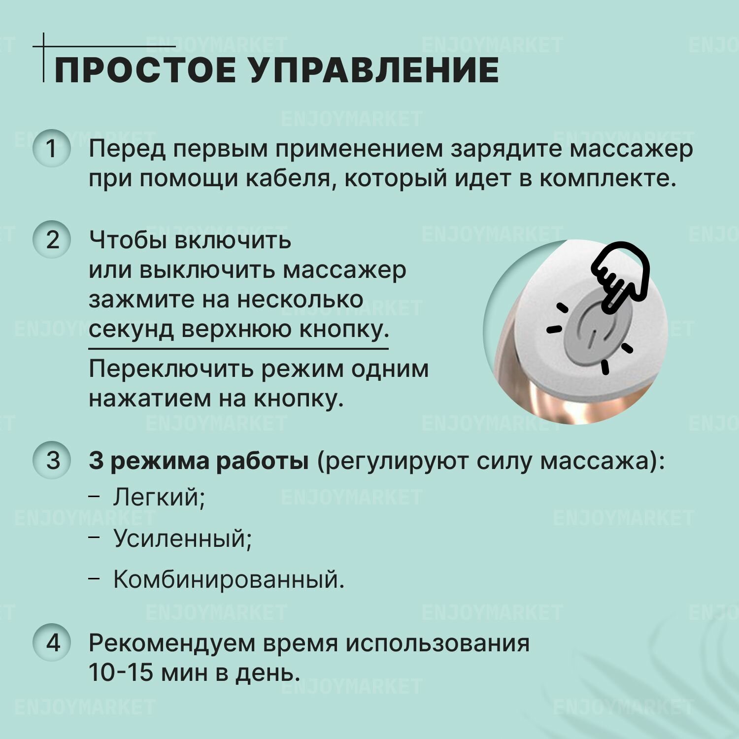 | Дополнительная информация | Перед началом использования прибора необходимо полностью зарядить встроенный аккумулятор. Чтобы включить массажер, достаточно нажать верхнюю кнопку Вкл/Выкл. Аппарат по умолчанию начинает работу на медленной скорости. Автоматический таймер по умолчанию активирован на 10 минут. Для изменения скорости и направления вращения массажных головок, необходимо однократно нажимать на кнопку Вкл/Выкл. Нажатие на нее приведет к переключению между круговыми движениями по часовой стрелке с медленной и быстрой скоростью, а также круговыми движениями против часовой стрелки с медленной и быстрой скоростью. Чтобы выключить устройство, достаточно удерживать кнопку Вкл/Выкл в течение 3 секунд. |