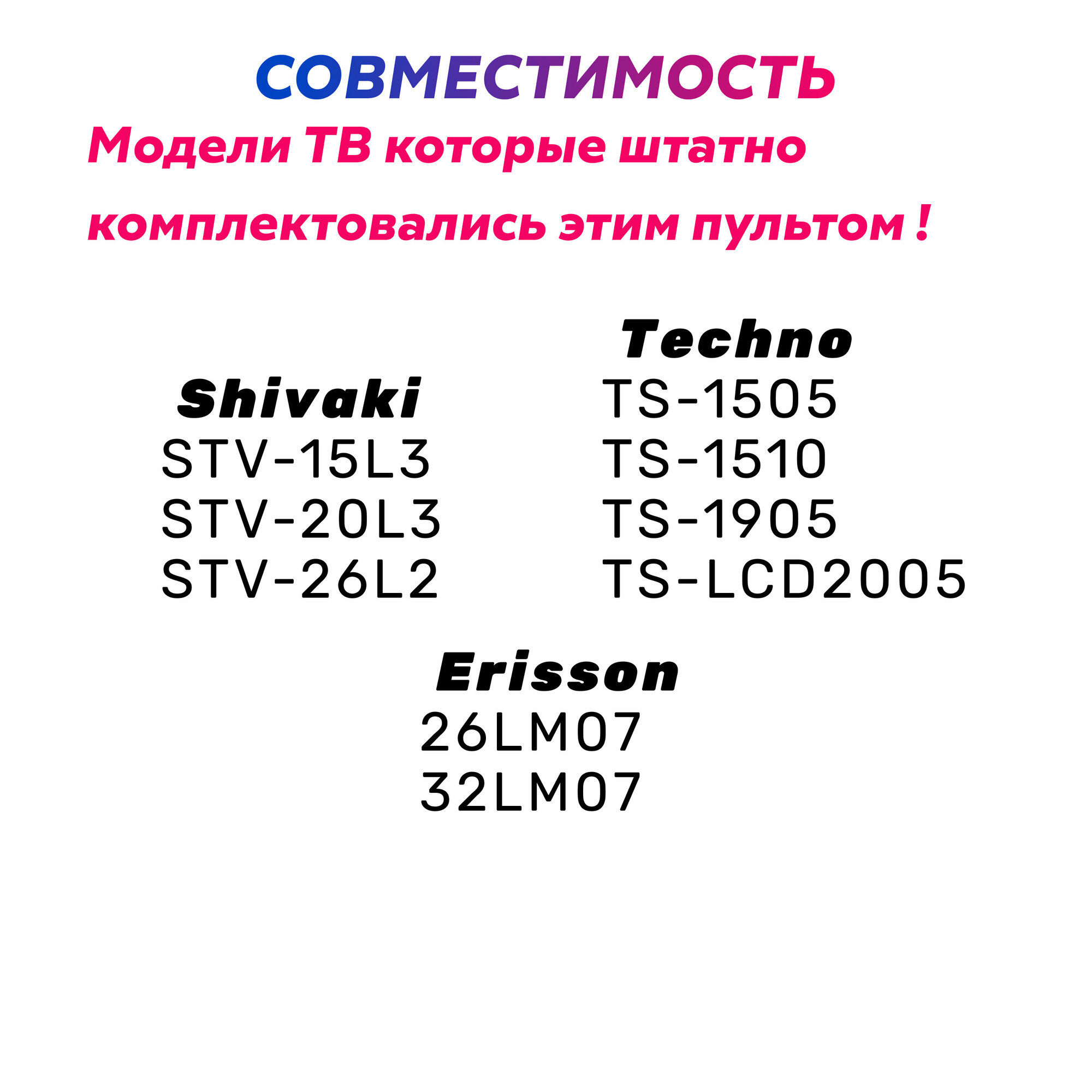 | Производитель совместимых устройств | Erisson / Orion / Shivaki / Techno |