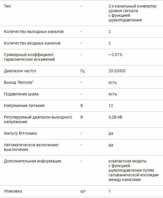 2-х канальный конвертор (преобразователь) сигнала высокого уровня в сигнал низкого уровня RCA. Выход для дистанционного включения усилителя.