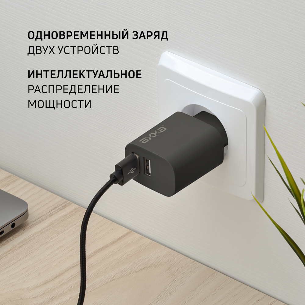 10 цен на Сетевое зарядное устройство USB-A + USB-A, 12Вт, черный, ахха, AXXA 2402