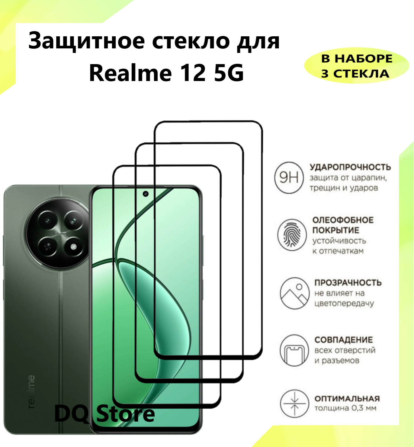10 цен на 3 Защитных стекла на Realme 12 5G / Реалми 12 5Джи . Полноэкранные защитные стекла с олеофобным покрытием