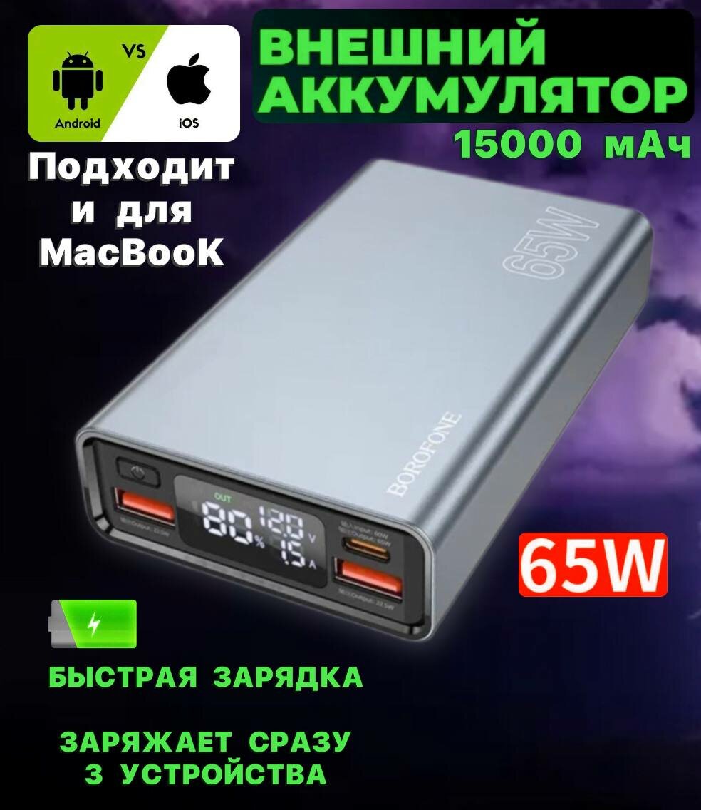 Внешний аккумулятор 15000 mAh Borofone BJ40 PD65W, для ноутбука и MacBook серый металлик информация:
