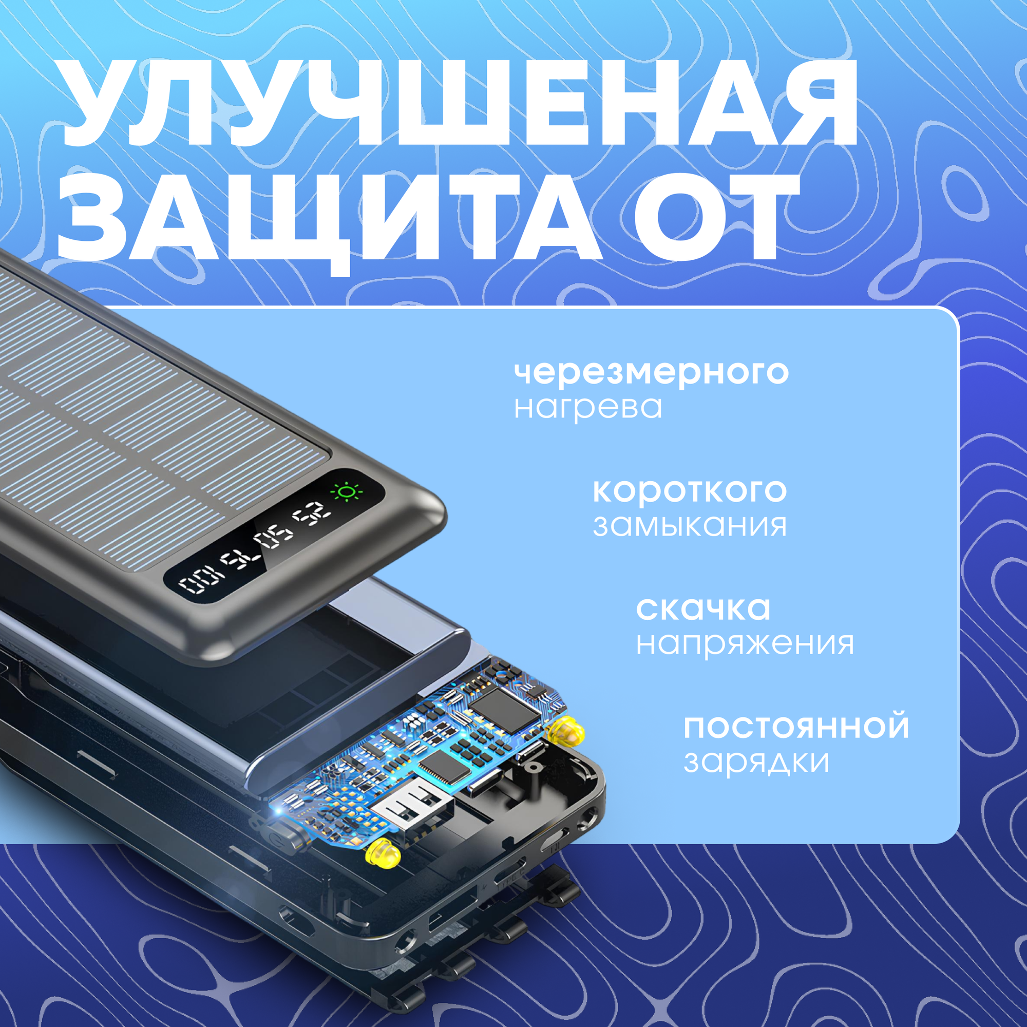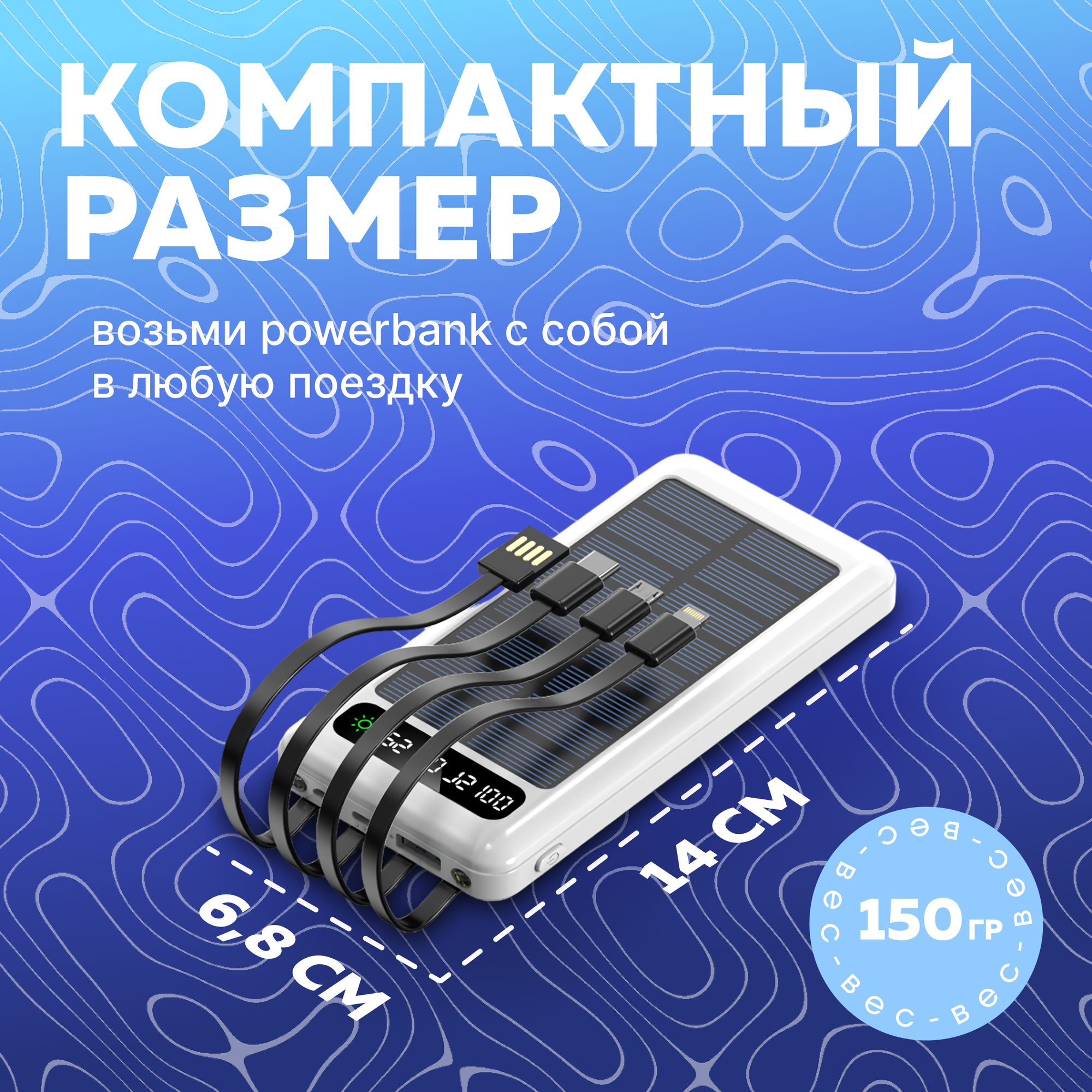 Мощный портативный повербанк 50000mAh, Внешний аккумулятор, встроенные кабеля, солнечная батарея, фонарик информация: