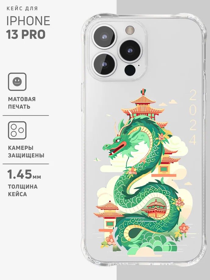 Отзывы на Противоударный чехол на Айфон 13 Про / iPhone 13 Pro прозрачный с принтом "Dragon with temple"