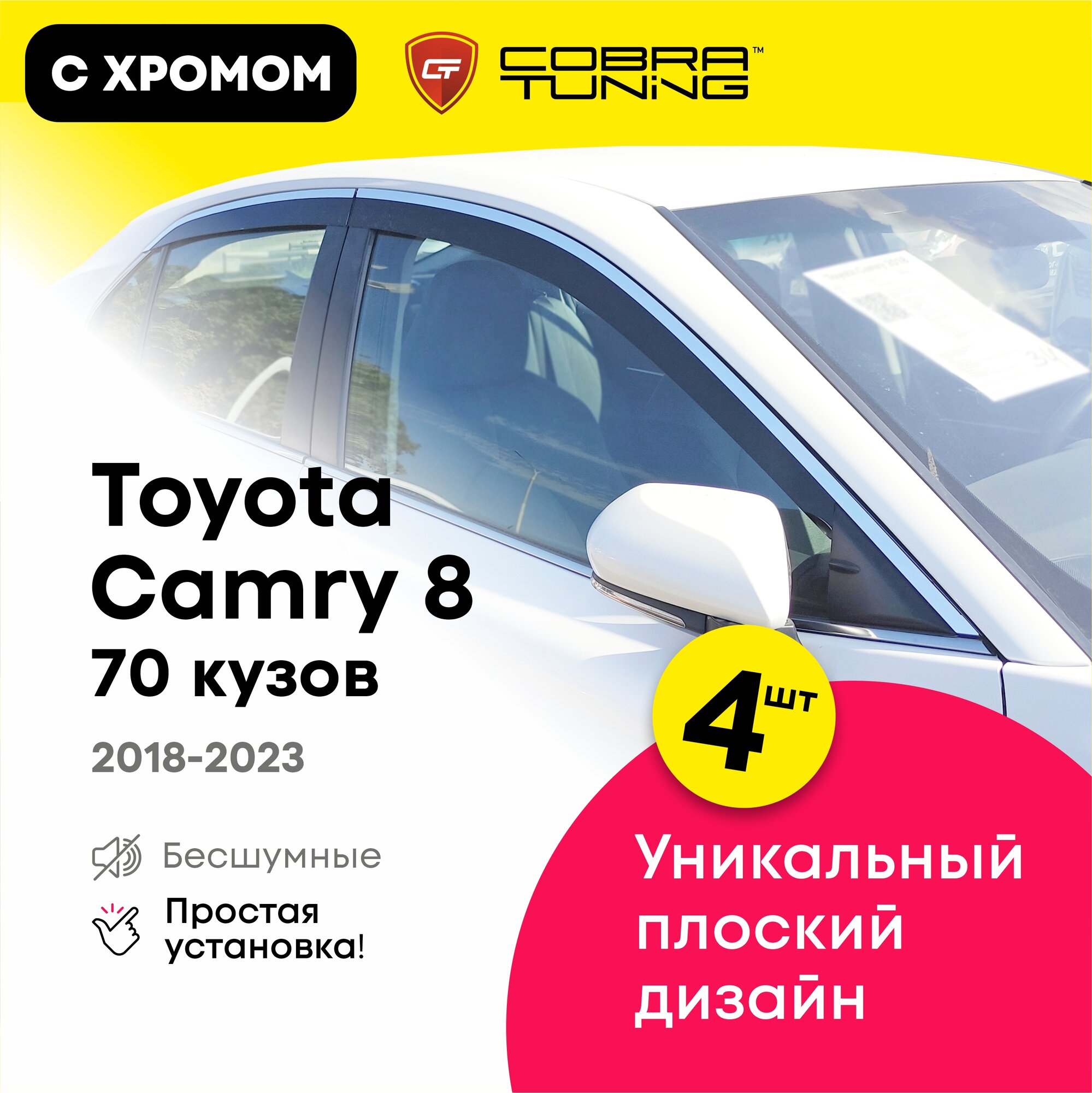 Отзывы на Плоские дефлекторы окон для Toyota Camry 8 (Тойота Камри) 70 кузов 2018-2022, 2D ветровики с хром молдингом, Cobra Tuning 4 шт.