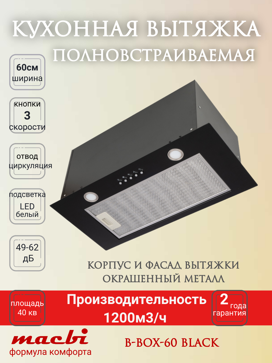 Вытяжка кухонная MACBI B-BOX-60 (BLACK) черный металл, 1200 м3/ч информация: