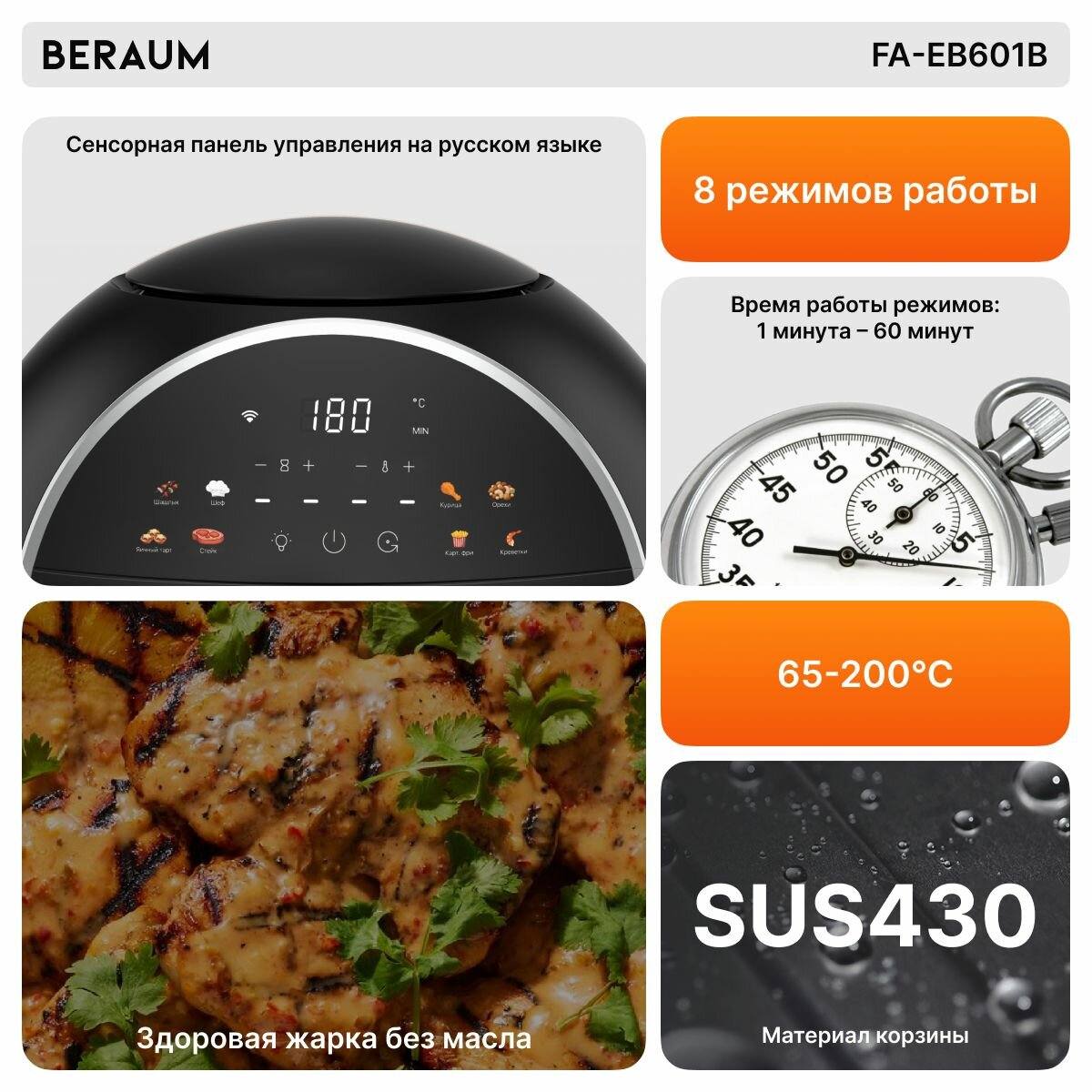 Отзывы на Аэрогриль Beraum FA-EB601B с вертелом, корзиной-барабан и решеткой для гриля