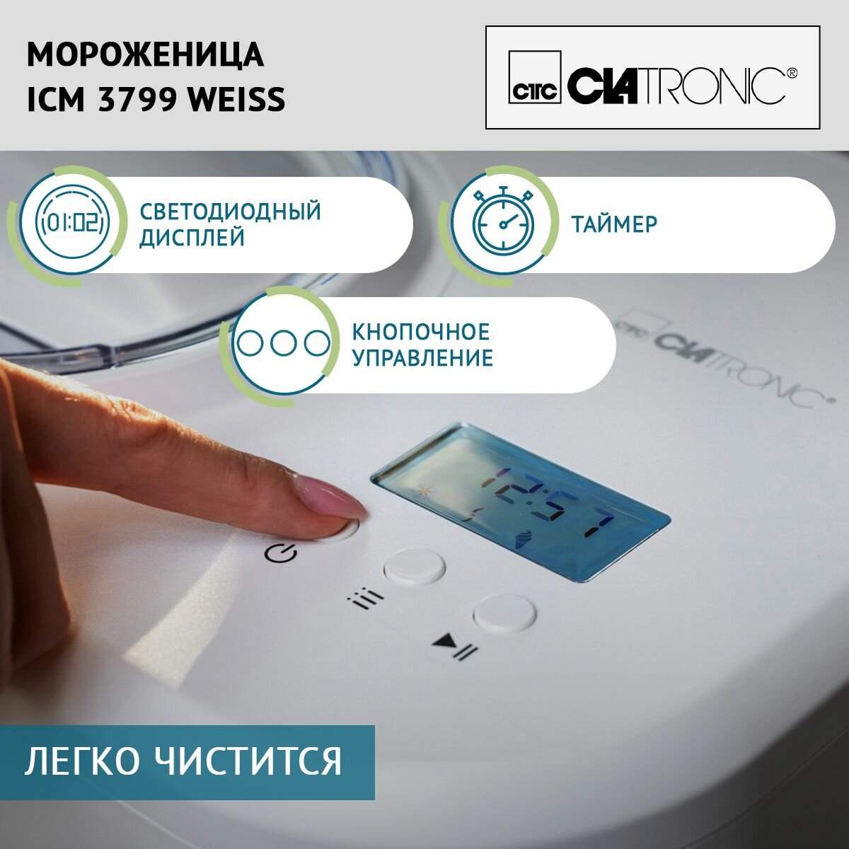 10 цен на Мороженица Clatronic ICM 3799 weiss автоматическая, время приготовления 20-25 мин, ёмкость 1000 мл
