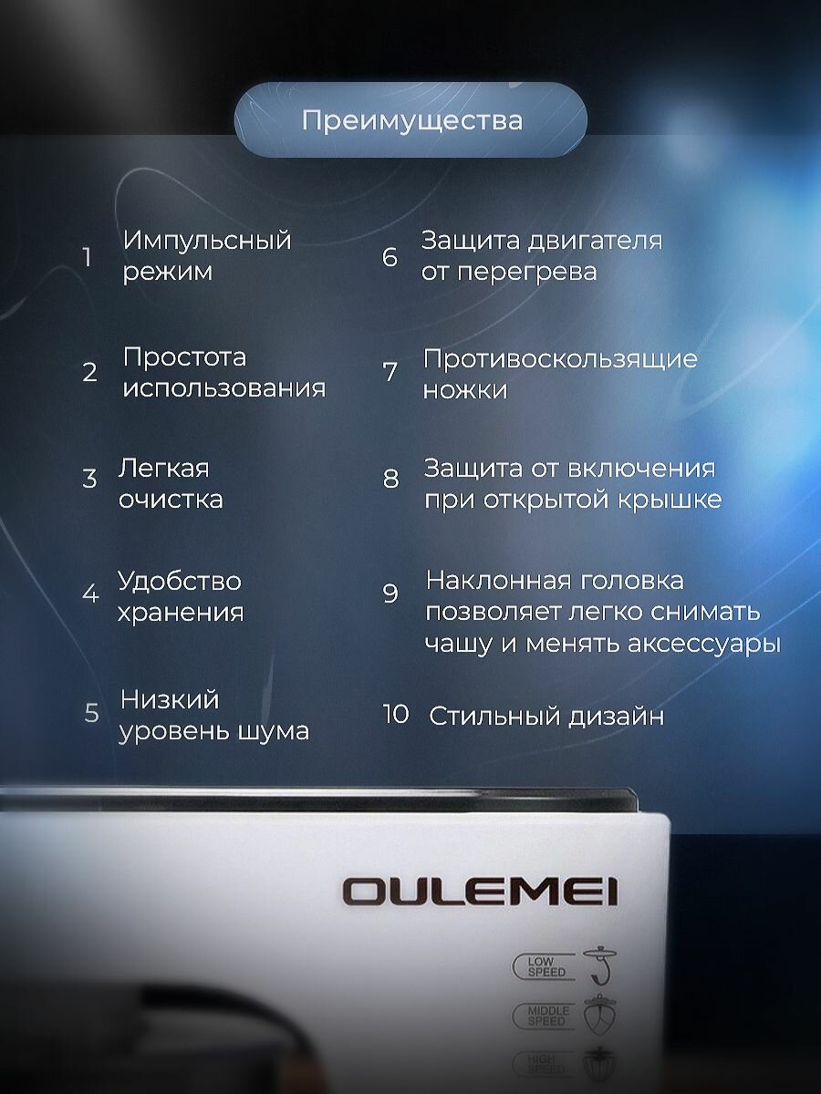 | Особенности конструкции | защитная крышка на чашу, кнопка отсоединения насадок |