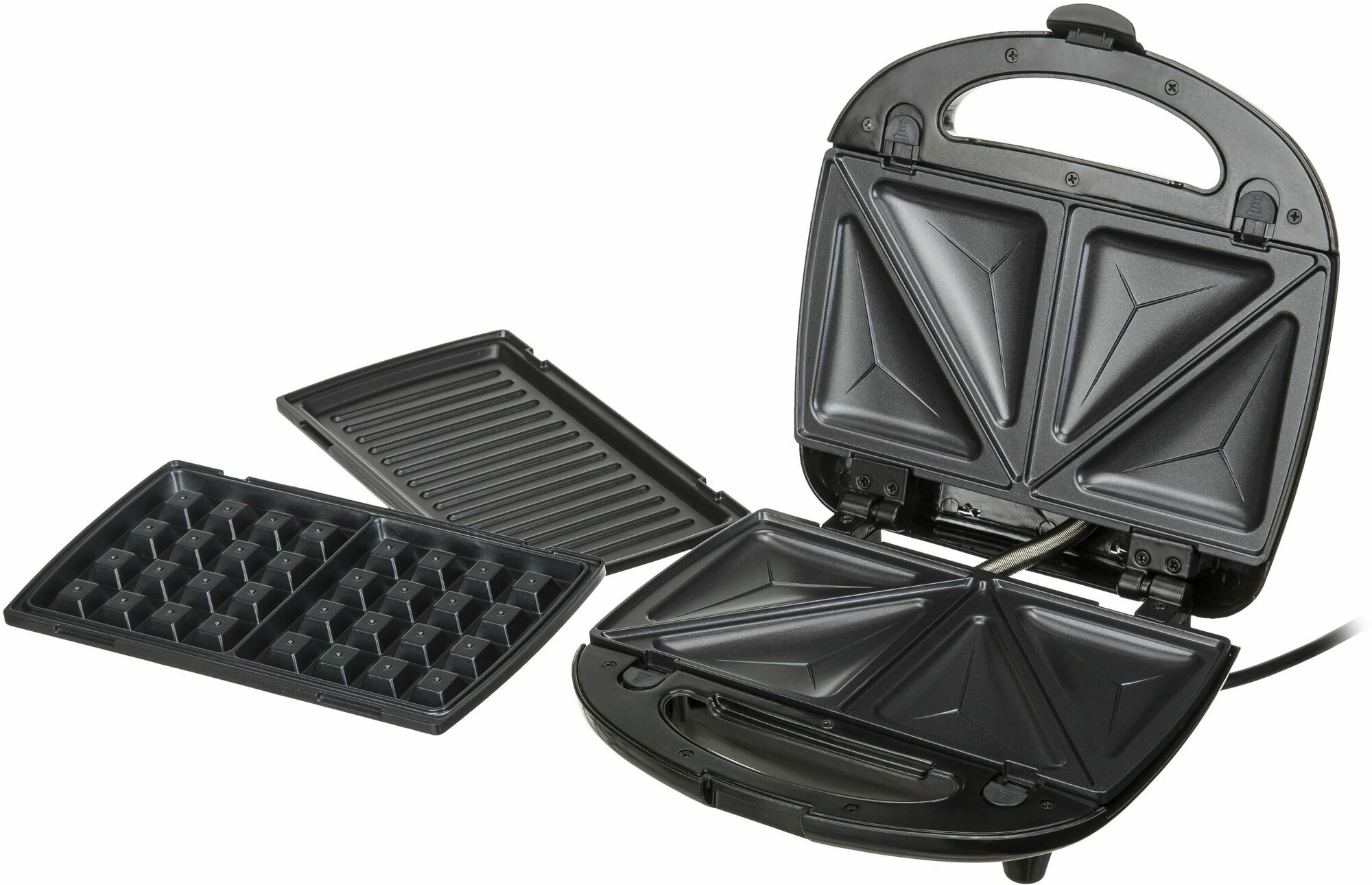Гриль электрический, Мультипекарь 3в1 с 3 сменными панелями (гриль, сэндвичи, вафли), с термостатом и антипригарным покрытием, 1500 Вт, черный информация:
