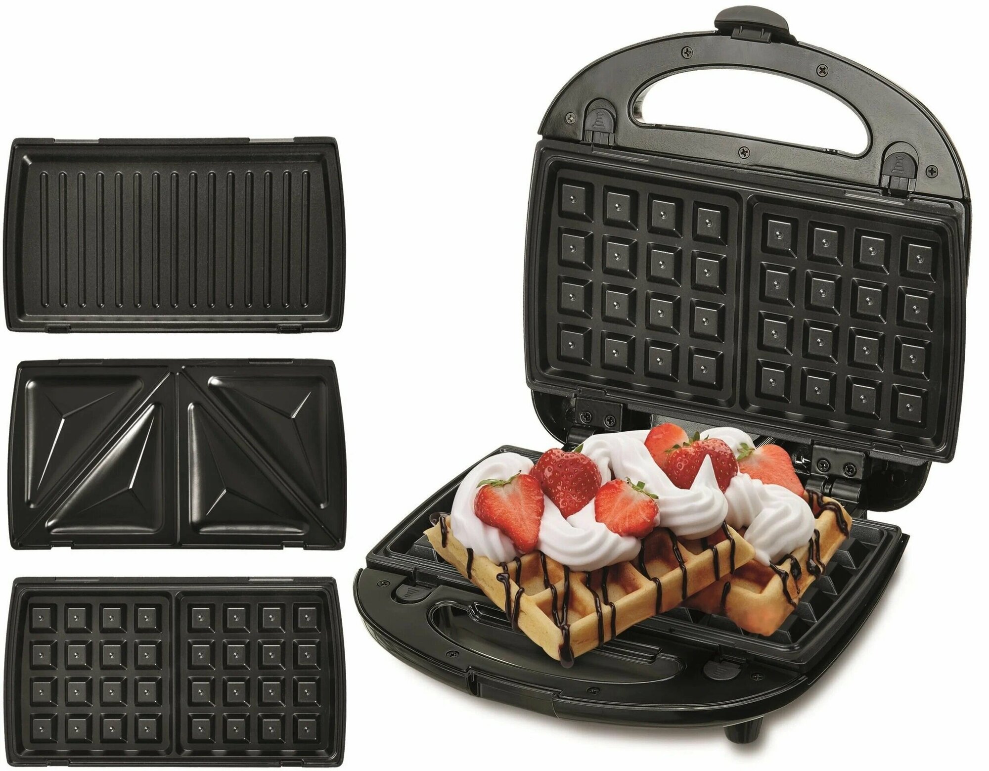 10 цен на Гриль электрический, Мультипекарь 3в1 с 3 сменными панелями (гриль, сэндвичи, вафли), с термостатом и антипригарным покрытием, 1500 Вт, черный