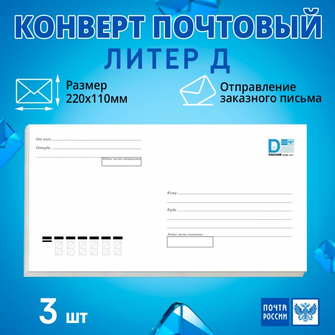 Отзывы на Конверт (3 штуки) с маркой почтовый маркированный литер D, 110х220 мм, заказное письмо