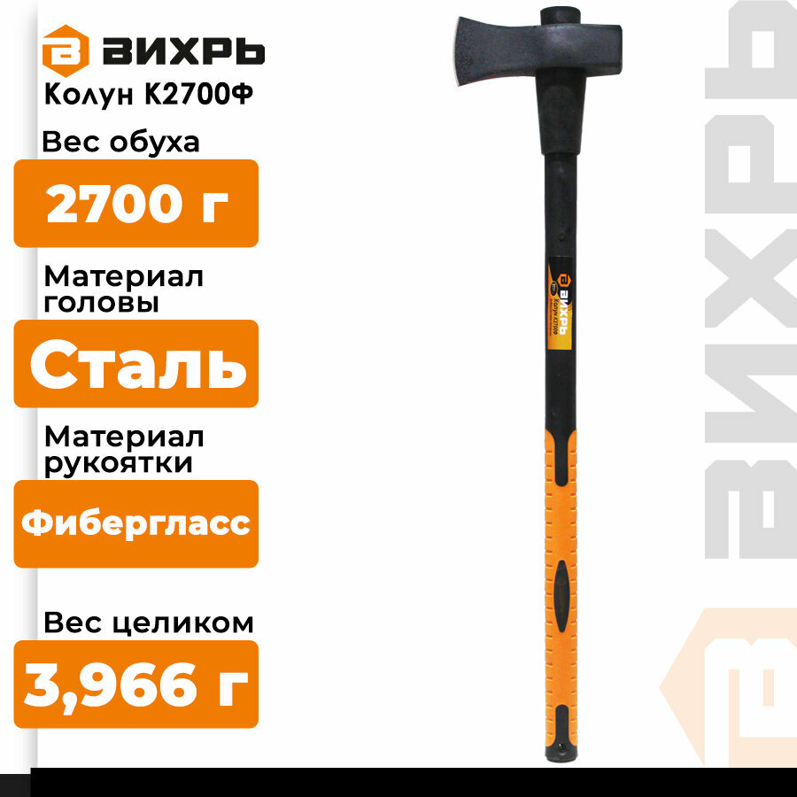Колун "Вихрь" К2700Ф, фиберглассовое топорище, 2.7 кг, рукоятка 900 мм Вихрь 3404409