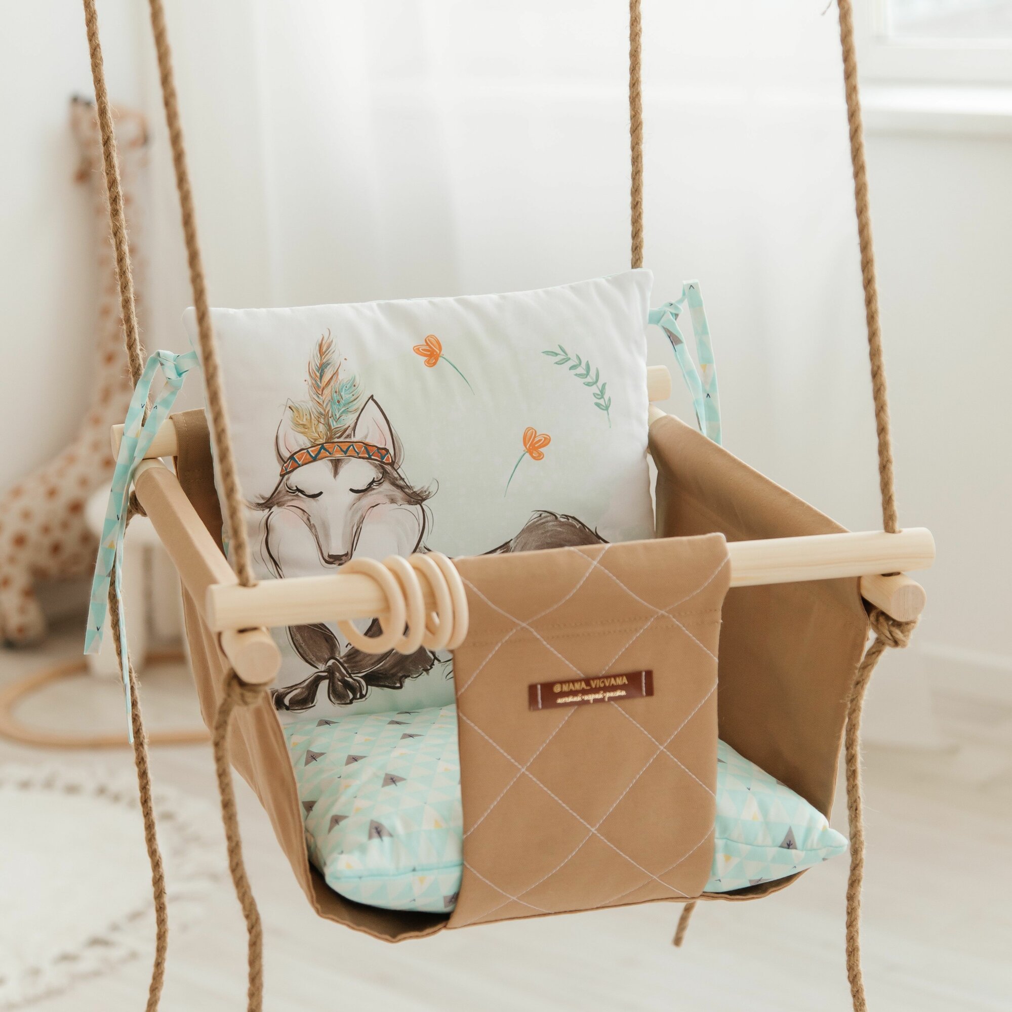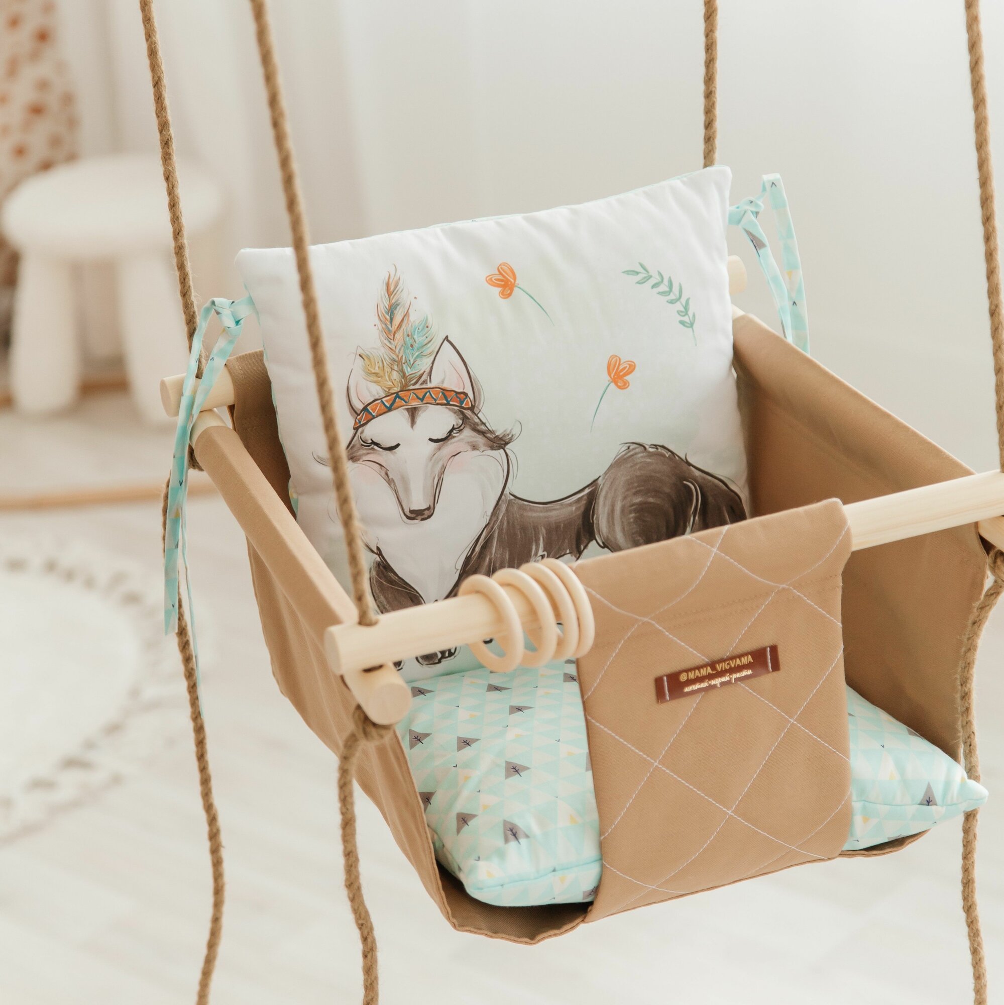 10 цен на Качели подвесные детские с 6 мес тканевые с ремнем безопасности для дома и дачи "Лесные жители" подушка Волк.