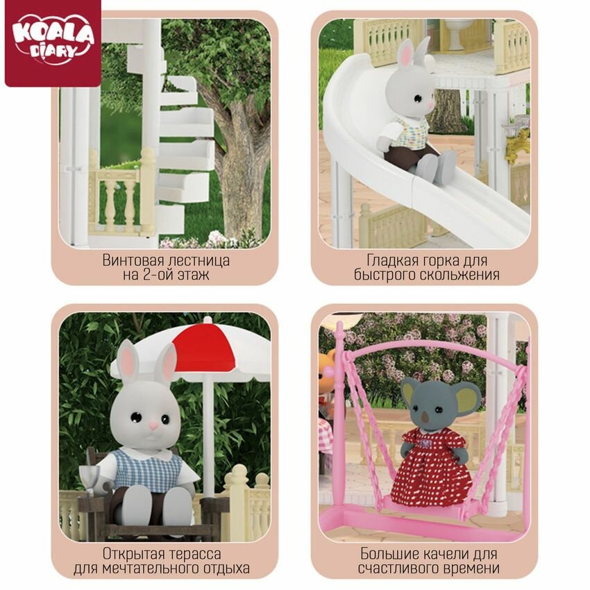 Трёхэтажный кукольный домик с мебелью, балконами, террасой и милыми зверушками, новогодний подарочный детский игровой набор информация:
