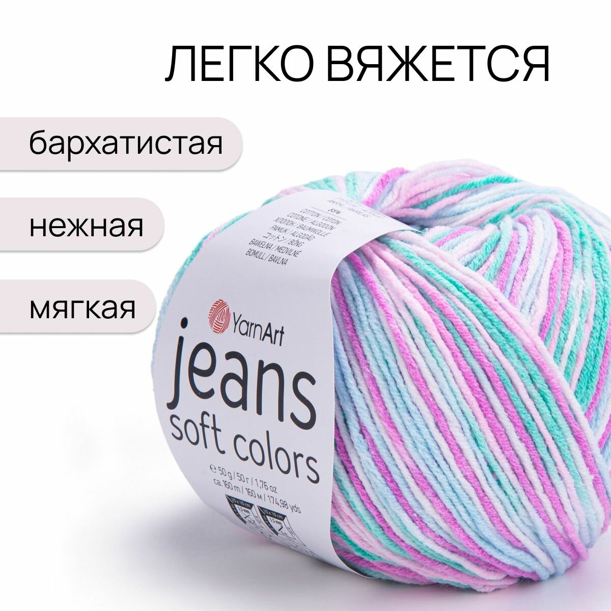 Пряжа YarnArt "Jeans Soft Colors", 50 гр 160 м, 55% хлопок, 45% акрил, 6202 секционный, 10 шт 1 782 ₽