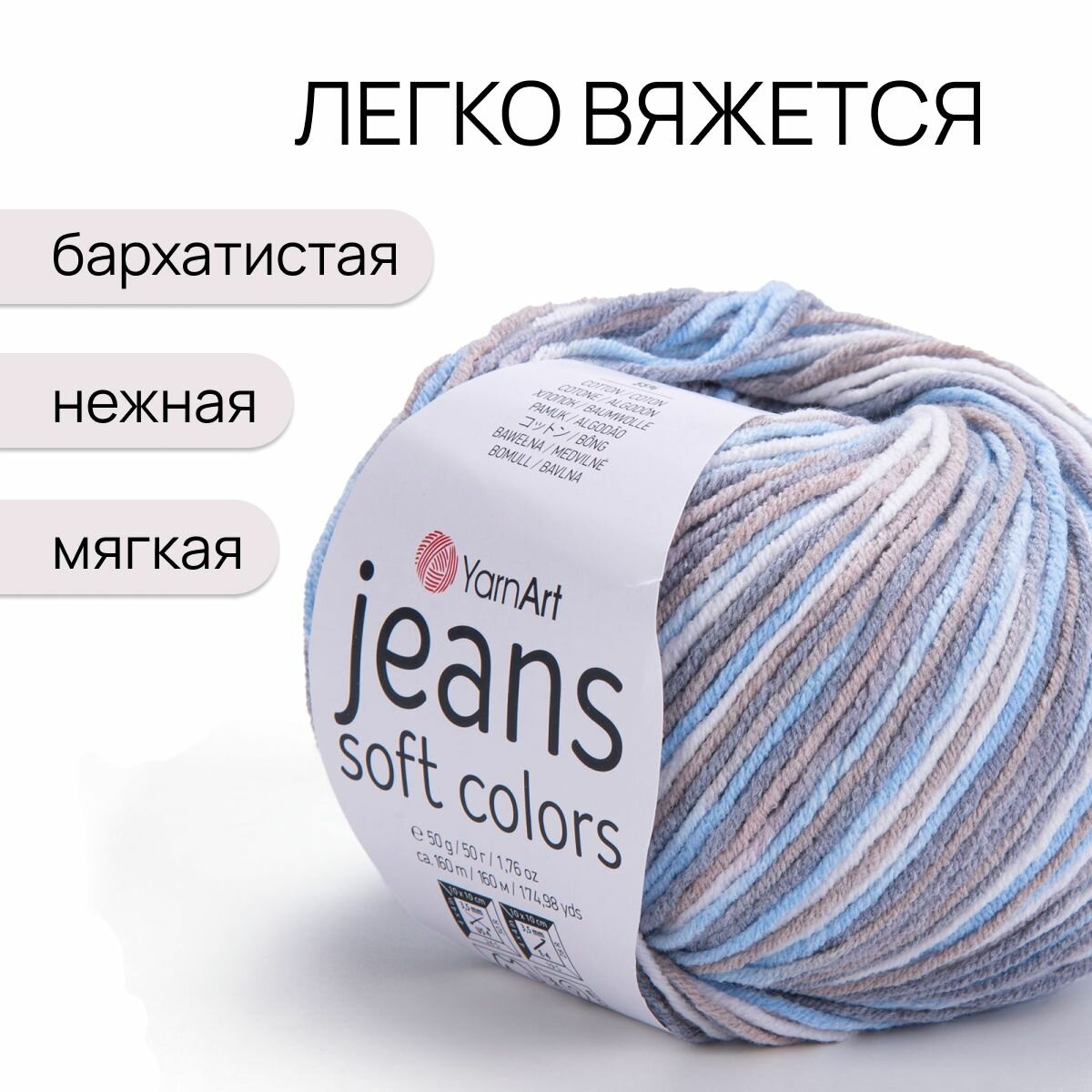 Пряжа YarnArt "Jeans Soft Colors", 50 гр 160 м, 55% хлопок, 45% акрил, 6201 секционный, 10 шт 1 659 ₽