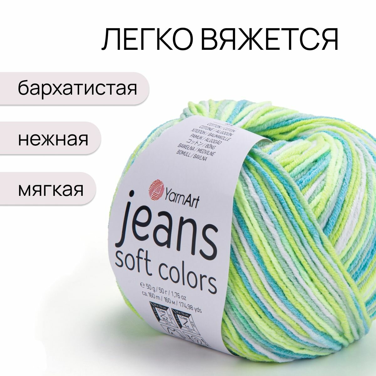 Пряжа YarnArt "Jeans Soft Colors", 50 гр 160 м, 55% хлопок, 45% акрил, 6202 секционный, 10 шт 1 782 ₽