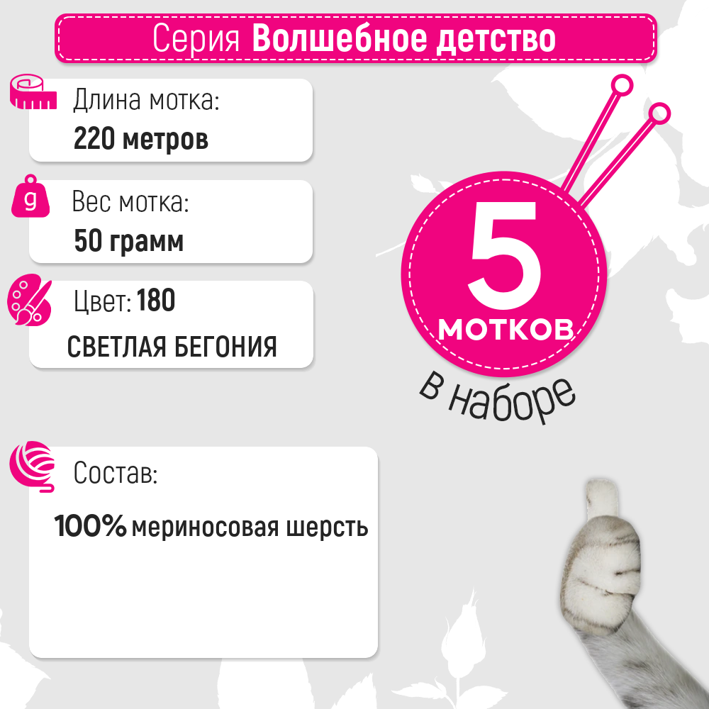Пряжа Пехорка 'Волшебное детство' 50г, 220м (австралийский меринос) (180 светлая бегония), 5 шт 1 585 ₽